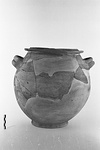 | Description: | Broken into many fragments of which not a few are missing; restored in plaster. Low base ring. Barrel-shaped body. Around the lip a broad flange to receive the lid. Two double, horizontal handles. Gritty buff clay, decorated with three bands of brown glaze around the upper wall and another on the lid flange. Between the two upper bands a garland of ivy in brown glaze. Cf. P 3567. | |