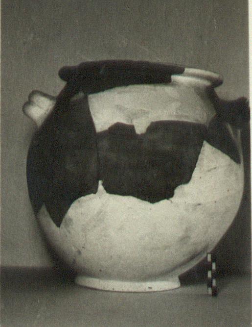 | Description: | Broken into many fragments of which not a few are missing; restored in plaster. Low base ring. Barrel-shaped body. Around the lip a broad flange to receive the lid. Two double, horizontal handles. Gritty buff clay, decorated with three bands of brown glaze around the upper wall and another on the lid flange. Between the two upper bands a garland of ivy in brown glaze. Cf. P 3567. | |