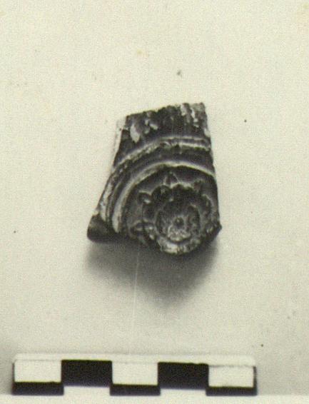 | Description: | Medallion fragment with finely worked rosette which has two rows of petals and a third of sepals. Good glaze. Cf. Agora XXII, no. 108. | |