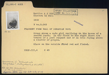 | Description: | Wall fragment depicting nude girl reclining on the knees of a seated youth. In the field to the right are traces of a goat rampant and of an Eros flying above a cluster of grapes. Glaze on the outside fired red and flaked. Cf. Agora XXII, nos. 109-113, p. 109. | |