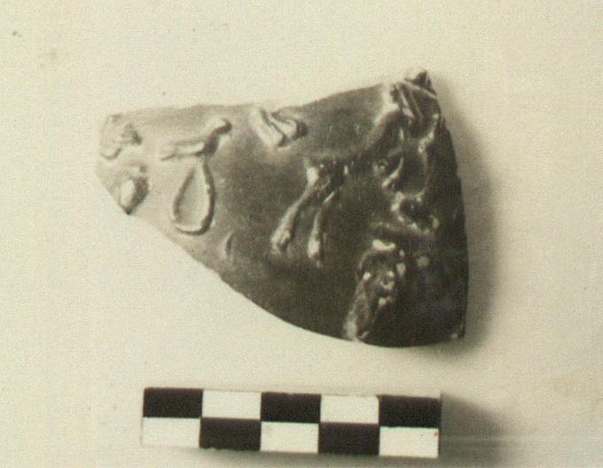 | Description: | Wall fragment depicting rampant goat, long-bearded mask and krater. Firm black glaze. Cf. Agora XXII, nos. 109-113, p. 109. | |