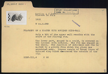 | Description: | A bit of upper wall with the start of the flaring rim. The lower part, shaped in a mould, is covered on the outside with nodules. The rim was shaped on the wheel. The junction of side wall and rim is marked by a groove from which the glaze is scratched away. Traces remain of broad lines of thinned clay which decorated the outside of the lip. | |