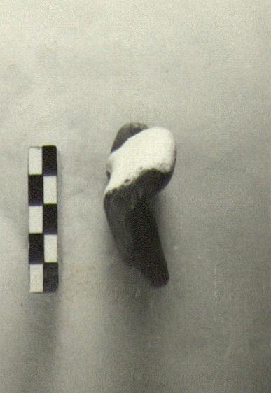 | Description: | Lip fragment with a single shallow groove on the rim. Coarse clay with bits; gray-green as if from burning. Traces of a cream slip. | |