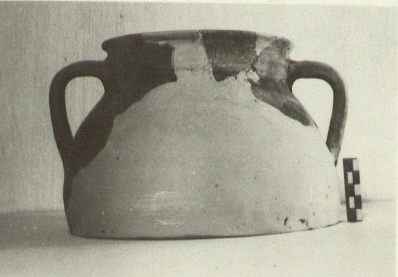 | Description: | Only the upper part with the two handles preserved. Plump body; low, vertical neck with thickened lip; strap handles. Decorated on the outside with rude stripes of red paint. Gritty, flaky clay, buff-yellow in color. | |