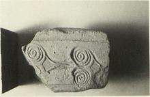 | Description: | Flat rim, projecting on exterior and slightly on interior, stamped with a large guilloche-like pattern. Moderately coarse pinkish-buff clay; traces of a light slip on the underside of the rim. | |