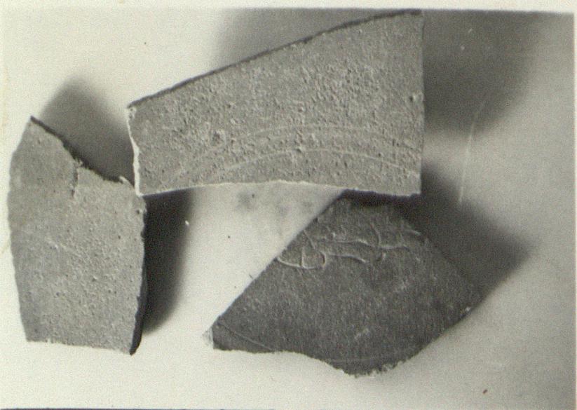 | Description: | Late Roman B fragments: a) Part of the ring foot. b) From the floor with a representation incised beneath the glaze within a circle. Figure with the preserved right arm bent at the elbow and the right leg frontal. c) From the floor with the spring of the foot along the inner edge. d) Two joining fragments of rim added Jan. 1964 from K 17 and K 67. Coarse red clay; red glaze wash on the inside. ADDENDA Jan. 1964: Piece added to b) from K 24 preserving part of foot. | |