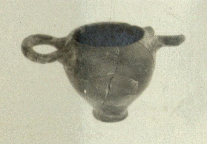 | Description: | Repaired from several fragments; most of one handle missing. Egg-shaped body tapering to a very small raised foot and curving in sharply at rim; two handles. Rather coarse pink clay. The glaze simply a dull wash. | |