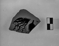 Description:   From the shoulder of a krater, glazed inside, the glaze thinner toward the top. Head and shoulder of a bearded man, wearing a spotted skin, and with flowing locks; he must be bent over toward the right. Brush drawing for the hair and beard. Fine relief lines.