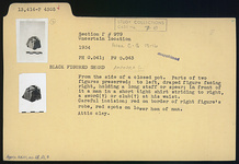 | Description: | From the side of a closed pot. Parts of two figures preserved: to left, draped figure facing right, holding a long staff or spear; in front of it a man in a short tight shirt striding to right, a sword(?) or club(?) at his waist. Careful incision; red on border of right figure's robe, red spots on lower hem of man. Attic clay. | |