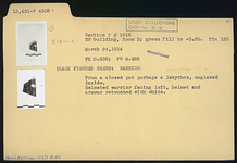 | Description: | From a closed pot perhaps a lekythos, unglazed inside. Helmeted warrior facing left, helmet and armour retouched with white. | |