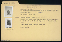 | Description: | From a pot with unglazed interior; on outside the head of a boar facing left; traces of red on his brow. Field sown with incised rosettes. Attic clay. | |