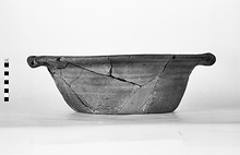 | Description: | Deep bowl with thumb-print handle. Restored in plaster. Flat bottom with slanting sides and a flat projecting rim. Horizontal handles pressed against the rim. Glazed dark reddish-brown inside and unglazed outside, fired to a grayish-green around the upper part. | |