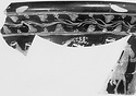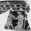 | Description: | a) Near the top of the fragment is an ovolo band; below is a nude male figure facing to the left, his hair bound by a white band. He holds some indistinguishable object in his outstretched right hand. Above his head to the left are the arms and cross bar of a lyre. b) Wall fragment depicting both upper and lower zones divided by a band of egg and dot. Of the upper zone are the feet of two draped figures hurrying right; of the lower zone the head and shoulder of a garlanded youth, right, with a scarf billowing out behind his shoulders. At the left, the hand of a figure, right, holding a filleted torch. White for the line of rocky ground in the upper zone, for the boy's fillet and for a streamer on the torch. Attic clay; black glaze inside. Belongs with P 5107. | |