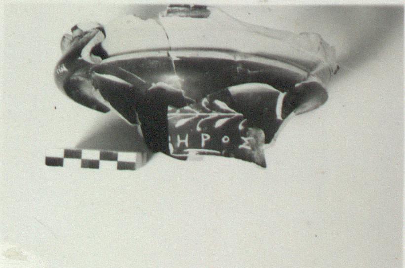 | Description: | Complete circle of upper part of body preserved. Much of lip missing. A non-joining fragment. The upper part of a large kantharos with a hollow bulge on exterior, just below out-turned lip. On body below bulge a garland in west slope paint, and below this an inscription: ΗΡΟΣ No trace of handle attachments on lip; were probably of high curving type. Good black glaze inside and out. Restored in plaster. | |