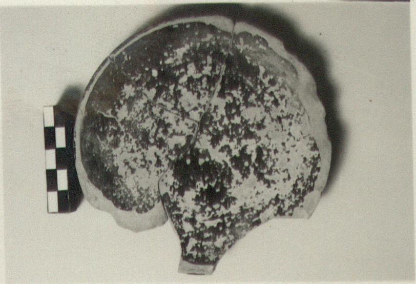 | Description: | Fragments of rim and body missing. Rounded, slightly in-turned rim. Ring base. Metallic black glaze, much flaked, fired brown on part of exterior. Restored in plaster. | |