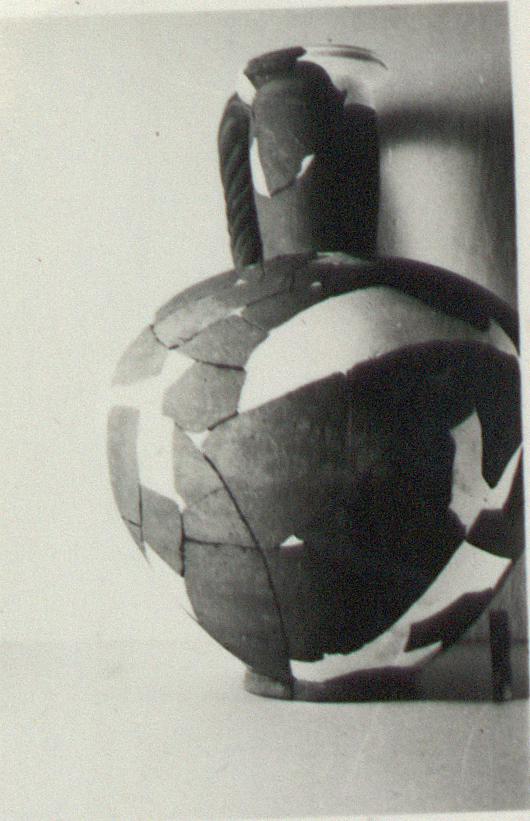 | Description: | Much of lip and considerable portions of body missing. Spherical body; low ring base; tall narrow neck with moulded projecting lip. Single vertical handle, twisted. Dark buff clay, micaceous, with particles. Light buff slip. Carefully incised in front on shoulder in large letters: ONHCIΦΟΡΟΥ Cf. P 11142. Restored in plaster. | |