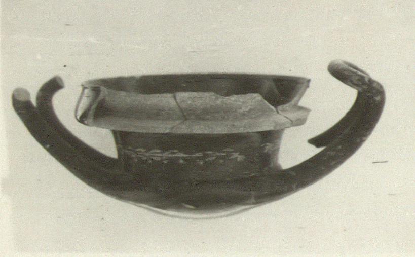 | Description: | Foot, part of handles and part of outer edge of rim broken away. Horizontal handles. Breaks show how heavy rim was made: near the lip the body of the vase divides in two parts, one continuing to form the lip, the other projecting horizontally for ca. 0.015m. An added band of clay, extending from the lip to the edge of this projection, forms the rim. Hard black glaze mottled with red, and showing red where it has been chipped away. Inside, hatched bands; outside, wreath, in heavy buff paint. Attic clay. | |