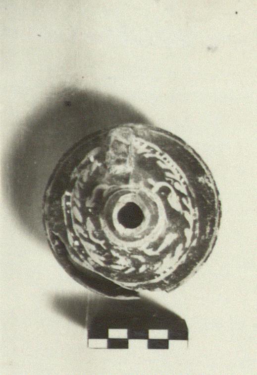 | Description: | Neck, ring handle, and a bit of one side missing. Low solid foot, slightly concave. On top in clay-colored paint, a wreath with white dots; above it, also in clay-colored paint, two pairs of very crudely drawn dolphins. Buff-brown clay, slightly micaceous. Thin metallic glaze, brown in spots outside and under foot. | |