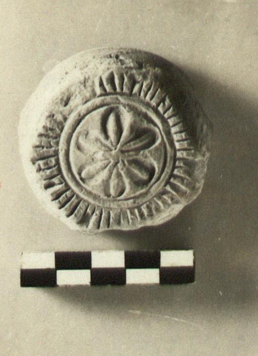 | Description: | A single fragment preserves part of the bottom of the mold with its low foot. Rosette at center, from which radiate lines (for ribbed-type bowl), separated by lines of jewelling. Grayish buff clay, slightly micaceous. | |