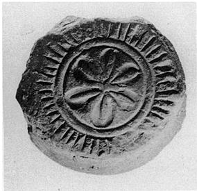 | Description: | A single fragment preserves part of the bottom of the mold with its low foot. Rosette at center, from which radiate lines (for ribbed-type bowl), separated by lines of jewelling. Grayish buff clay, slightly micaceous. | |