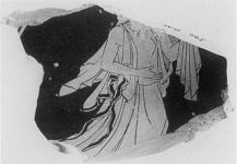 | Description: | Draped female figure moving swiftly to right; the head of the figure is missing and the legs below the knees. She wears a peplos bordered with black; a piece of accessory drapery floats behind and is held in front by her raised left arm; the right arm is bent at the elbow. Her necklace with dot pendent is rendered in dilute glaze (cf. P 18604). Relief lines fine and accurate; red clay; fine black glaze; on the underside the spring of the stem of the kylix is preserved. | |
