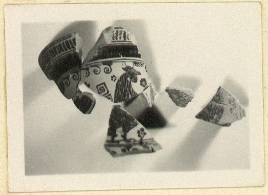 e) Joins a) above. Fragment from junction of neck and shoulder. On the neck, the mid-part and feet of a cock, with a dot rosette in field. On the shoulder, the hook spirals that bordered the main panel, together with a small part of a figure. Deep brown glaze.