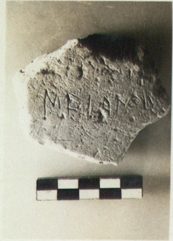 | Description: | On inside, traces of thin brown glaze. Graffito on outside. <graphic> Heavy fabric, light buff clay with bits. Ostrakon? | |