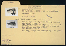 Description:   From a large open pot, glazed inside; decorated with animal frieze. Left, front of bird, and right, head of neck of grazing goat, facing. Purple red on chest and wing of bird, and neck of goat. Goat in field between.