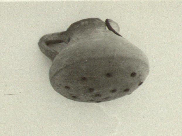 | Description: | Mended from two pieces; complete save minor chips. Large perforated convex bottom. Sixteen perforations ca. 0.003 in diameter. Buff clay. Traces of white and red. Salt shaker(?). | |