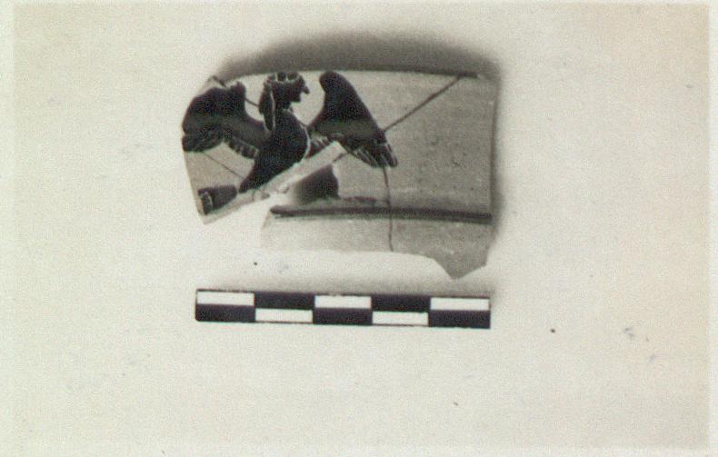 Description:   A small piece, mended from five fragments, from the center of one side of a cup, with lip offset inside and outside. On outside, a siren right, with wings spread. Purple red: wing and tail band; traces of white beside wing bands and on face. A reserved line at the edge of the lip, inside.