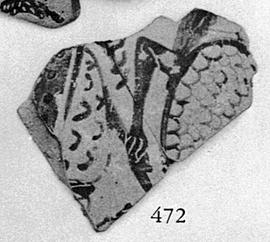 Description:   From a large closed pot. Part of two figures moving right, the one leading the other, grasping it by the hand. Of the left figure part of the dress is preserved: purple belt, and bodice divided diagonally into differently patterned halves, purple dots in one. (Cf. the dress of the "Fury", Τ 175). Of the right hand figure, the bodice covered with scale pattern, part of the hair and the neck with necklace are preserved.