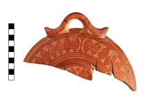 Description:   Profile preserved from part of the base up to the handle. Dull red decoration. Lozenges similar to those on the side also on the rimless bottom. On bottom between points of lozenges at outer edge, are crude six-pointed stars (or rosettes). The interior is completely covered with dull red paint.