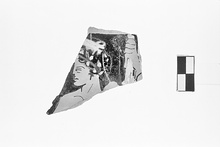 Description:   Fragment of a bell krater, shiny black inside. The head, one shoulder and one hand of a youth. He stands facing, but looking toward his right. His left hand is raised, and rests on a spear. On his head, a wreath and a "crown". White for the crown, for dots on wreath, and for spear. Traces of brown inner markings. Relief contours for the flesh.