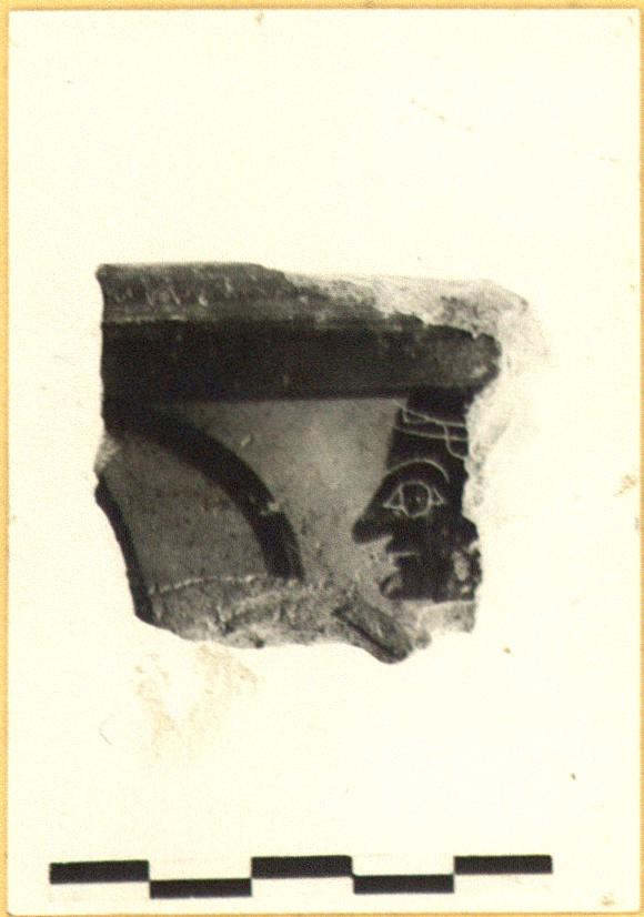 | Description: | From a lidless lekanis. The face of a siren(?), left; in front of her a curved line, lion's tail(?) Glaze fired red inside. | |