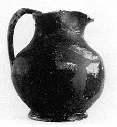 | Description: | Ring foot, heavy rounded body and wide trefoil mouth, with one vertical handle. Small pieces of body missing. Attic clay; glaze mottled black to red; inside, thin streaky glaze. Fine thin fabric. | |