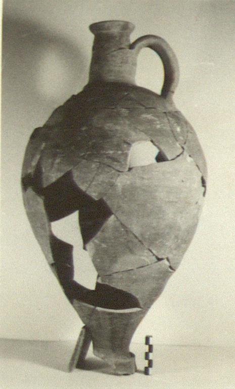 | Description: | Nearly complete. Egg-shaped body, narrow straight neck, slightly outward flaring lip, one grooved handle, shoulder to neck. Stepped foot, hollow inside. Pinkish buff clay, dull red glaze. Incised on shoulder below handle. <graphic> | |