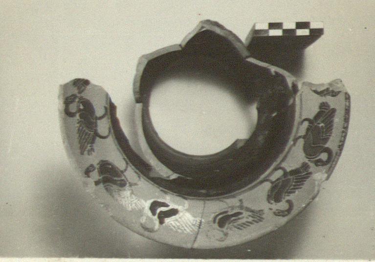 | Description: | Outward flaring keeled lip. On upper face of lip, procession of geese, right. On outer face of lip, between purple bands, "running dog". On front neck panel, gorgon running right, pick-like object in right hand; on back panel, lotus and palmette. Inside of neck glazed black, purple band around upper edge. ADDENDA Letter from G. G. Payne 10 April 1935: "There is a winged man, running to r., with a double axe in his right hand, in the University Collection at Bonn. Same sort of date as yours, but Boeotian, (Necrocor., p. 202, no. 13; winged man, not simply man); published in Schweitzer (1922), Herakles, fig. 16 and described also by Ure in AA (1933), p. 12, no. 3. This is the only parallel I can think of." "A suggestion as to the meaning of the winged man with the axe by Buschor in FR III, p. 216." Cf. BMMA (Summer 1962), (Metr.Mus.Bull.), pp. 31-36. Agora XXIII: Aristaios (head mostly missing), winged, running to right, looking around, with a pick in his right hand. | |