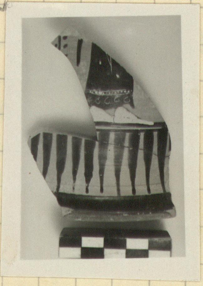 | Description: | Mended from two pieces. From a stand with flat outward projecting foot, painted purple on outer face. On the stand, above inverted rays, the feet and skirt of a woman walking right. White for flesh and row of dots at hem of skirt. Part of tendril in field behind. Additional fragments as follows: b) Parts of three figures; the one in the middle a man, that at the right a woman holding branches. c) Parts of two figures, the left one a man. d) Edge of a skirt and feet of a woman to right. e, f, g) Fragments from edges, either above or below. Fragment g) joins P 4689. | |