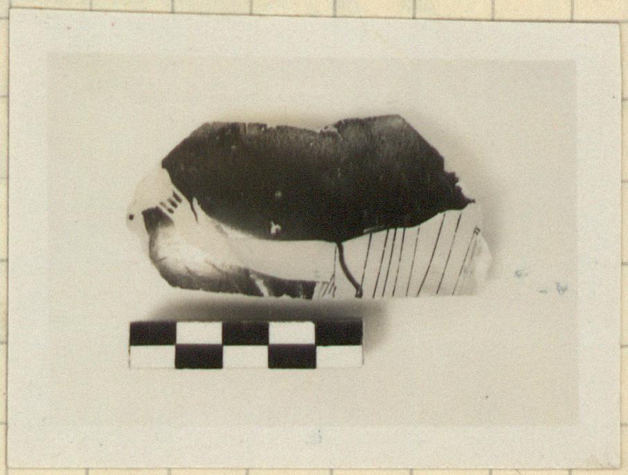 | Description: | From the shoulder of an open pot glazed black inside, over a rather rough surface. Part of a draped woman, left, extending her right hand, palm down. Beyond her, at left edge of the fragment, an indistinguishable bit of some other object. No relief contours. | |