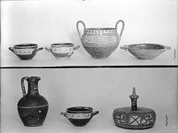 | Description: | Intact. Flat-bottomed cup with narrow straight lip and two horizontal loop handles, tilted slightly upward. Lower body and handles glazed black; in reserved handle band, four dot rosettes on each side. Lip and interior of body glazed save for reserved stripes on inner and outer faces of lip, and reserved circle in center of floor. Buff slip; dull, rather metallic black glaze. | |