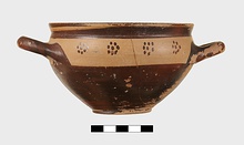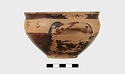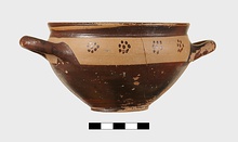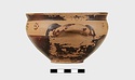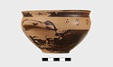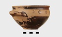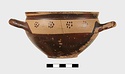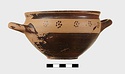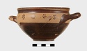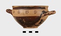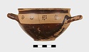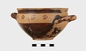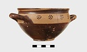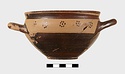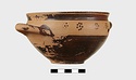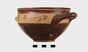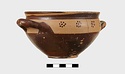 | Description: | Intact. Exactly like P 4773 (Β 1241) and P 4774 (Β 1242) in shape and decoration. On reserved handle band, five dot rosettes on one side, four on the other. Nine series of short hatched lines on reserved stripe inside lip. The glaze dark reddish brown to black; inside, chocolate brown. ADDENDA P 4773 and P 4774 are flat-bottomed cups with narrow straight lip and two horizontal loop handles, tilted slightly upward. Lower body and handles glazed black. | |