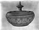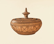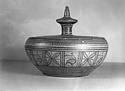 | Description: | Intact. a) Flat-bottomed bowl-shaped pyxis; convex side wall, flanged inside to receive lid. Lid and flange pierced for fastening. On pyxis body, at bottom: three bands, zigzag, three bands. A wide band divided by series of three vertical strokes into 16 metopes filled by birds and 4-petalled flowers alternating, the flowers each with four auxiliary straight dotted petals; in the field, horizontal and vertical rows of dots and zigzags. Above, to rim, a zigzag with three horizontal lines above and below. On bottom, inside three rings, a flower with 4 hatched petals; stars in field between ends of petals. b) Lid: flat round lid decorated with series of three narrow, one wide glazed band, alternating. Spiked knob handle with narrow glazed bands. Reddish buff clay, dull rather metallic black glaze. | |