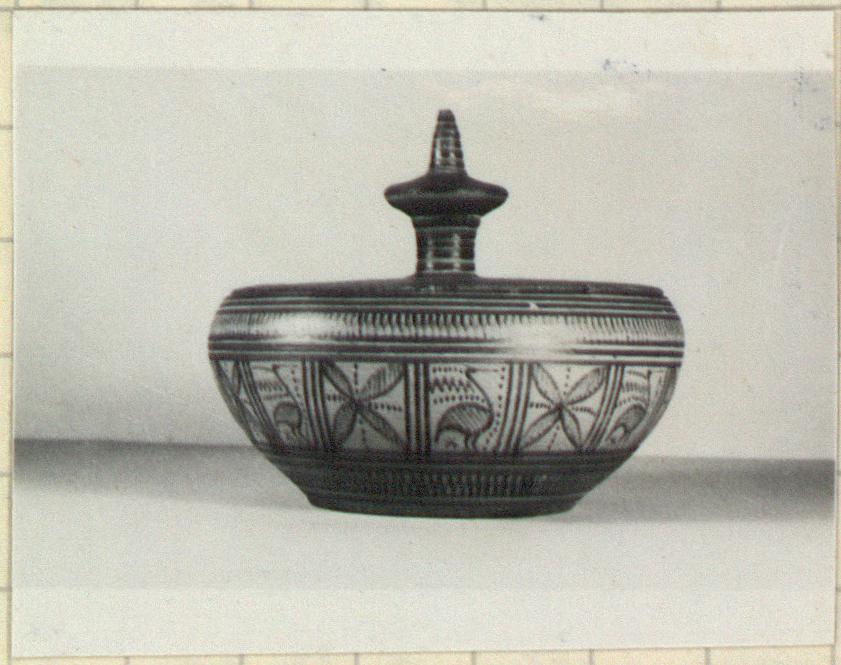 | Description: | Intact. a) Flat-bottomed bowl-shaped pyxis; convex side wall, flanged inside to receive lid. Lid and flange pierced for fastening. On pyxis body, at bottom: three bands, zigzag, three bands. A wide band divided by series of three vertical strokes into 16 metopes filled by birds and 4-petalled flowers alternating, the flowers each with four auxiliary straight dotted petals; in the field, horizontal and vertical rows of dots and zigzags. Above, to rim, a zigzag with three horizontal lines above and below. On bottom, inside three rings, a flower with 4 hatched petals; stars in field between ends of petals. b) Lid: flat round lid decorated with series of three narrow, one wide glazed band, alternating. Spiked knob handle with narrow glazed bands. Reddish buff clay, dull rather metallic black glaze. | |