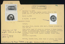 Description:   Intact. Low ring foot, convex side wall, flange pierced to tie lid on. Side wall: band of glaze at bottom; two black bands, series of alternating standing and hanging vertical lines; interlocking bands; 3 black simple maeanders, hatched; three black bands; zigzag; three black bands. Interior unglazed.