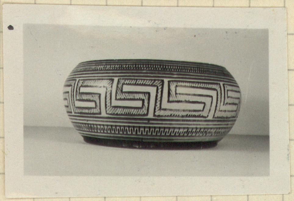 Description:   Intact. Low ring foot, convex side wall, flange pierced to tie lid on. Side wall: band of glaze at bottom; two black bands, series of alternating standing and hanging vertical lines; interlocking bands; 3 black simple maeanders, hatched; three black bands; zigzag; three black bands. Interior unglazed.