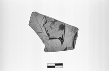 | Description: | From a large open red figured pot; on the outside parts of two draped figures. Incised on the interior through black glaze. <graphic> | |