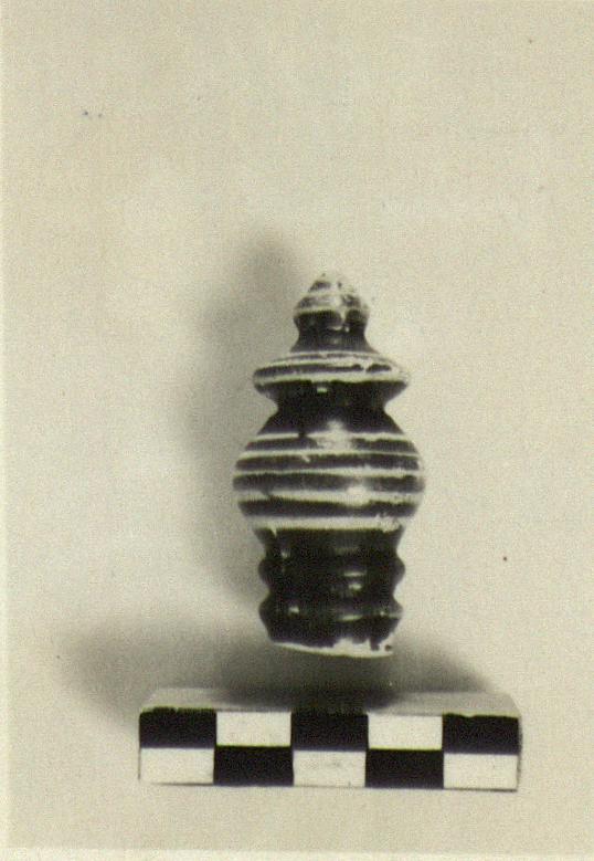 | Description: | From the lid of a pyxis; only the knob preserved; in the form of a little pyxis with no handles, and covered with a lid. Black and reserved bands. | |