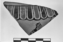 | Description: | Fragment from shoulder. Below tongue pattern, head and upper right arm of filleted female(?) figure holding lance(?) right. Applied purple for alternate tongues and for fillets and dress border; white (smoked blue-gray) for flesh and lance(?). Black glaze fired brown. Inside covered with same silvery lustred brown glaze. | |
