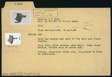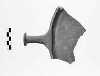 | Description: | Only the handle and part of the wall and floor remain. Very flat, with oblique side wall. Long round handle, hollow only at outer end. Gritty, micaceous brown clay, blackened by fire on underside. | |