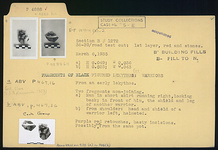 | Description: | From an early lekythos. Two non-joining fragments. (Possibly not from the the same pot.) a) Man in short skirt running right, looking back; in front of him, the shield and leg of another warrior. b) From shoulder: head and shield of a warrior left, helmeted. Purple red retouches, hasty incisions. | |